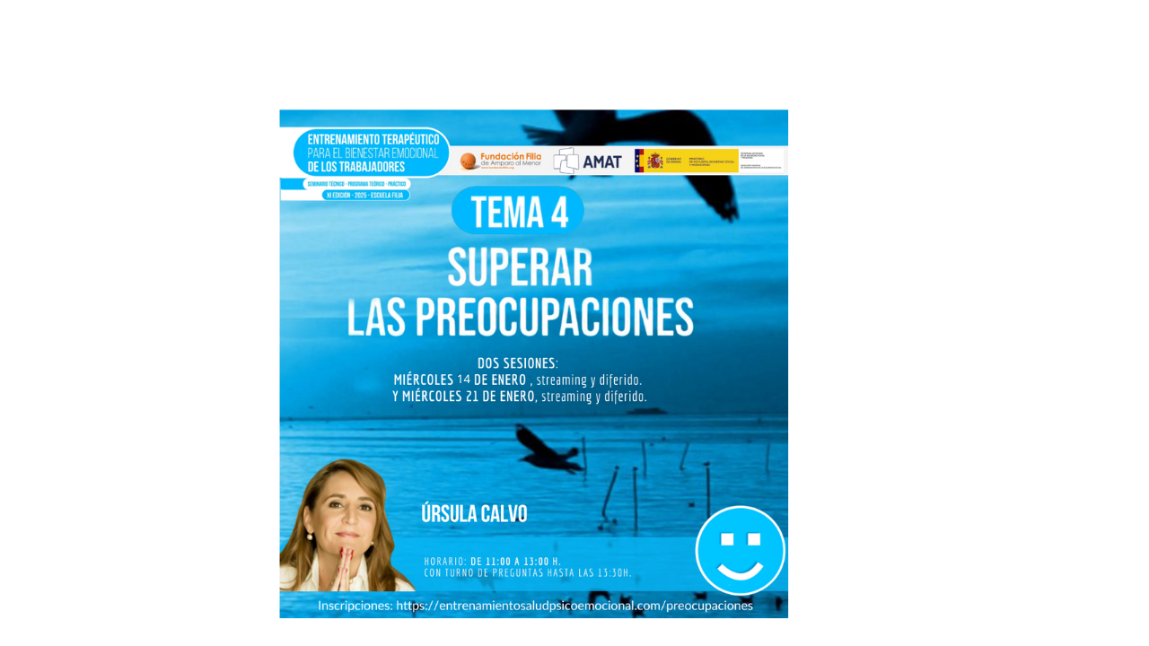 El miércoles 14 de enero de 11:00 a 13:00 horas y el miércoles 21 de enero de 11:00 a 13:00, tendrá lugar la conferencia "Superar las preocupaciones", impartida por Úrsula Calvo, experta en coaching e inteligencia emocional, así como en meditación y mindfulness.