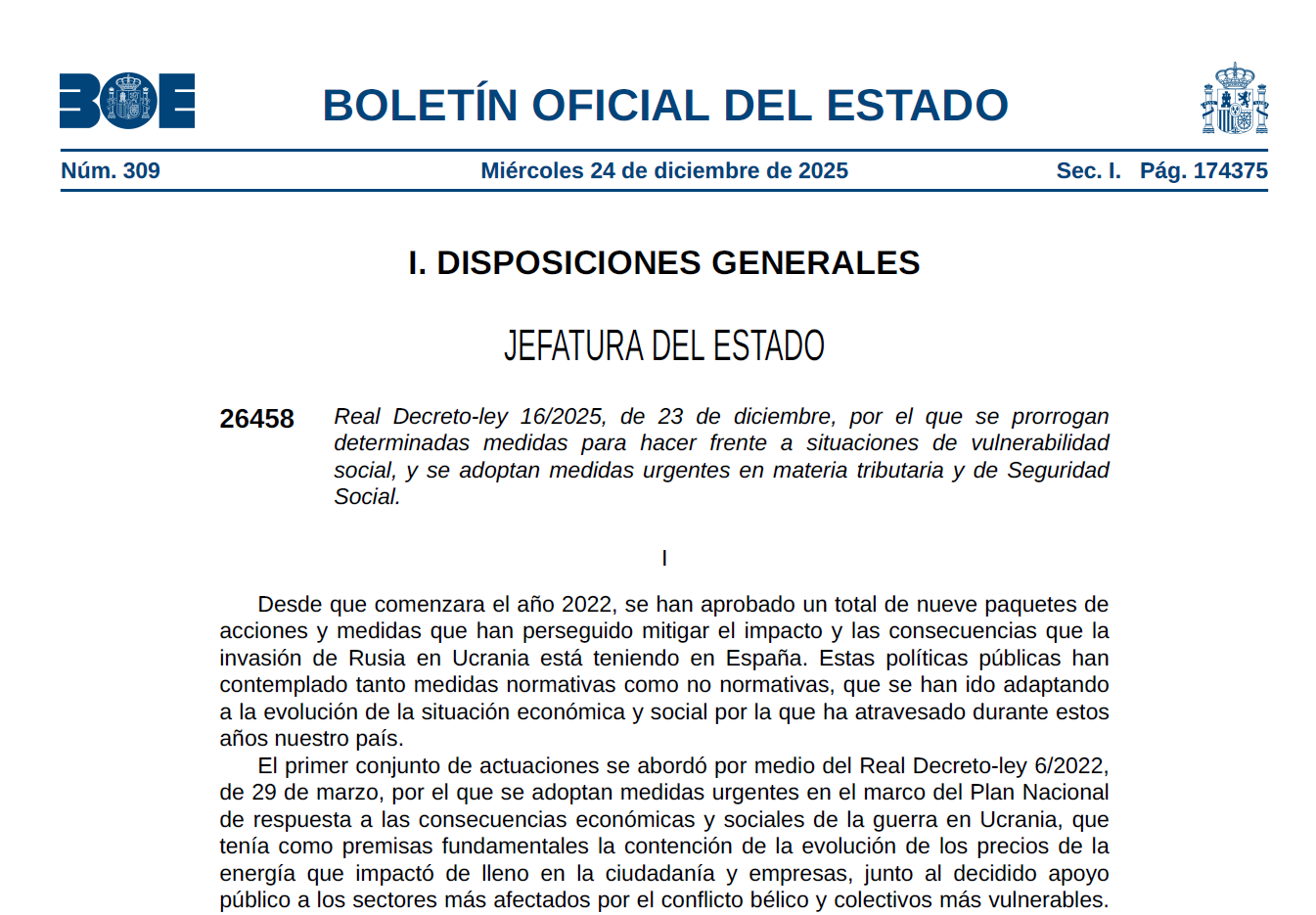 El Real Decreto-ley 16/2025, de 23 de diciembre, en la Disposición Final Primera, establece la nueva tarifa de primas para la Cotización a la Seguridad Social por accidentes de trabajo y enfermedades profesionales a partir del 1 de enero de 2026.